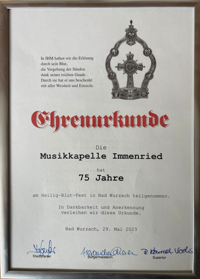 Im Jahr 2023 wurde der Musikverein für seine 75-malige Teilnahme beim Heilig-Blut-Fest in Bad Wurzach geehrt, bei welcher die Blutreitergruppe Immenried begleitet wird. Zahlreiche Immenrieder Musikanten nehmen schon über vier Jahrzehnten an der Prozession teil.